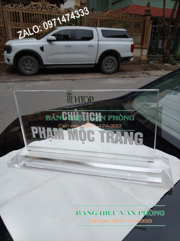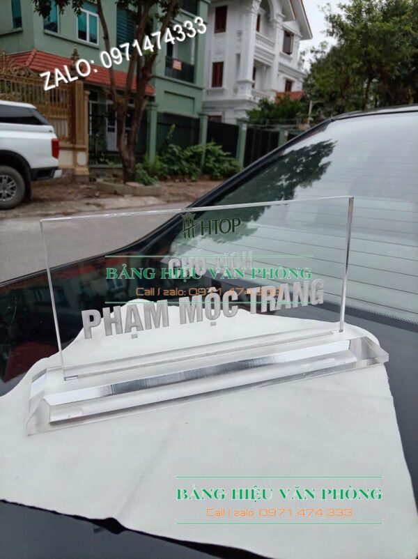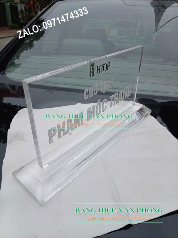 Biển chức danh để bàn làm từ mica trong suốt mang lại vẻ đẹp sang trọng cho văn phòng. Sản phẩm được chế tác từ mica Đài Loan cao cấp giúp bề mặt luôn sáng bóng. Độ dày của bảng mica trong để bàn thường từ 10mm đến 20mm tạo sự vững chãi. Công nghệ khắc laser hiện đại giúp nội dung hiển thị sắc nét và bền bỉ theo thời gian. Loại bảng tên đặt bàn này rất phù hợp cho các vị trí lãnh đạo như Chủ tịch hay Giám đốc. Thiết kế tối giản giúp không gian làm việc trở nên chuyên nghiệp và hiện đại hơn. Khách hàng có thể dễ dàng vệ sinh bụi bẩn bằng khăn mềm mà không lo trầy xước. Biển mica khắc nội dung theo yêu cầu giúp khẳng định vị thế của người sử dụng. Đây là lựa chọn hàng đầu cho các doanh nghiệp muốn xây dựng hình ảnh chỉn chu.